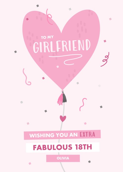 Verjaardagskaart met aanpasbare naam en de tekst: To my girlfriend wishing you an extra fabulous 18th Olivia