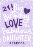 Vrolijke verjaardagskaart met de tekst: 21! Big birthday love to a fabulous daugter Rebecca. De naam op de kaart is aanpasbaar.