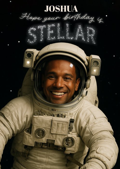 Met een lachende astronaut met een face-swap-foto-upload, in een wit ruimtepak die in de ruimte zweeft, omgeven door sprankelende sterrenachtige typografie.