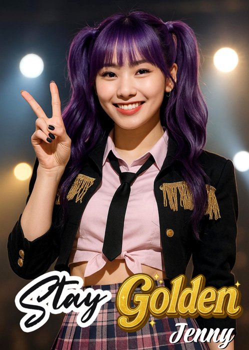 Met een lachend K-popsterretje met een face-swap-foto-upload, met paarse vlechtjes die een vredesteken maken met haar vingers.