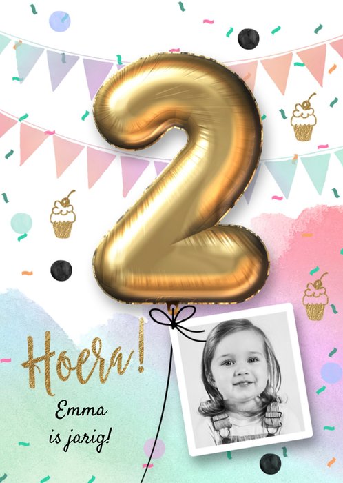Grappige verjaardagskaart met foto, naam en leeftijd. Door een foto toe te voegen, lijkt het net of hij/zij een feestmutsje op heeft.