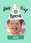 Grappige verjaardagskaart met foto, naam en leeftijd. Door een foto toe te voegen, lijkt het net of hij/zij een feestmutsje op heeft.