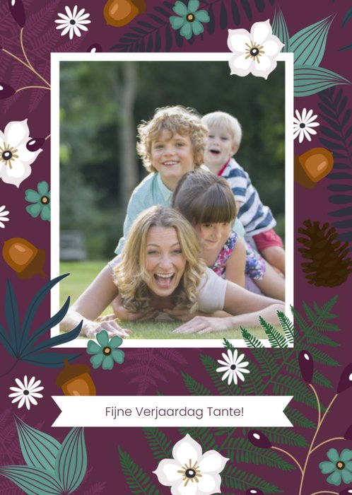 Mooie verjaardagskaart met bloemen en planten op de kaart. Je hebt de mogelijkheid om een eigen foto toe te voegen. Op de kaart staat: Fijne verjaardag Tante!