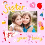 Schattige fotokaart met de tekst: Sister you're 7 today.