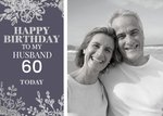 Fotokaart voor een jarige. Op de kaart staat: Happy birthday to my husband 60 today. De leeftijd is aanpasbaar.  Wenskaart van Greetz ontworpen door Greetz designers, volgens de laatste trends. Voeg je eigen foto('s), tekst, & versiering toe om de kaart extra persoonlijk te maken. Je kunt de kaart toevoegen aan je favorieten of tussentijds opslaan om deze later af te maken. Meer verjaardagskaarten zien? Check ze hier.