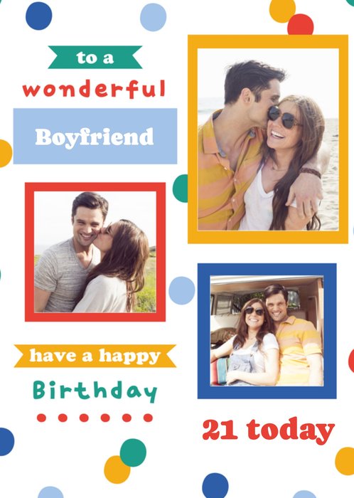 Vrolijke fotokaart met leeftijd en de tekst: To a wonderful boyfriend have a happy birthday 21 today.