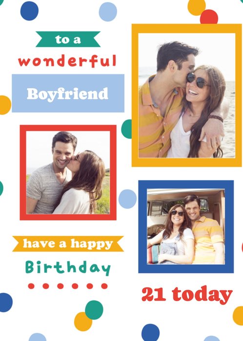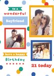 Vrolijke fotokaart met leeftijd en de tekst: To a wonderful boyfriend have a happy birthday 21 today.