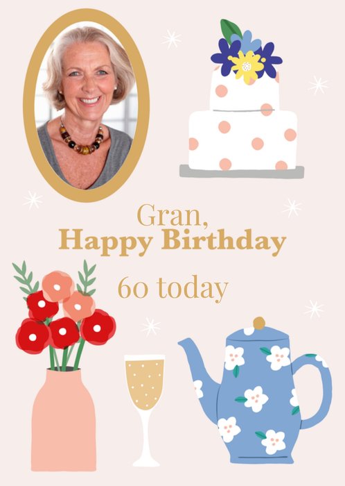 Vrolijke verjaardagskaart met foto en de tekst: Gran, happy birthday 60 today.