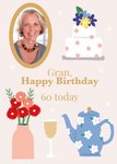 Vrolijke verjaardagskaart met foto en de tekst: Gran, happy birthday 60 today.