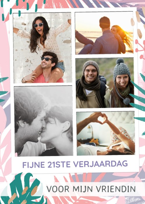 Vrolijke verjaardagskaart met plek voor 5 foto's en de tekst: Fijne 21ste verjaardag voor mijn vriendin. De tekst is aanpasbaar.