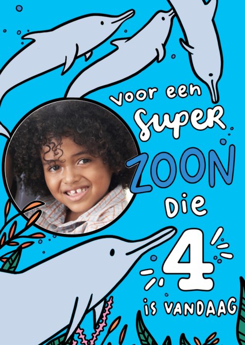 Dolfijnenkaart met foto en leeftijd. Op de kaart staat: Voor een super zoon die 4 is vandaag.