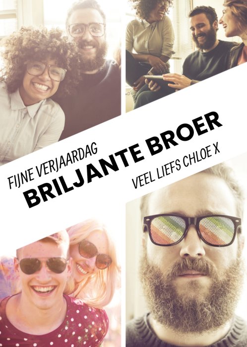 Leuke fotokaart voor een jarige broer. Op de kaart staat: Fijne verjaardag briljante broer veel liefs Chloe x. De naam is aanpasbaar.
