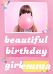 Roze fotokaart met foto en aanpasbare naam op de kaart staat: Beautiful birthday girl Emma.