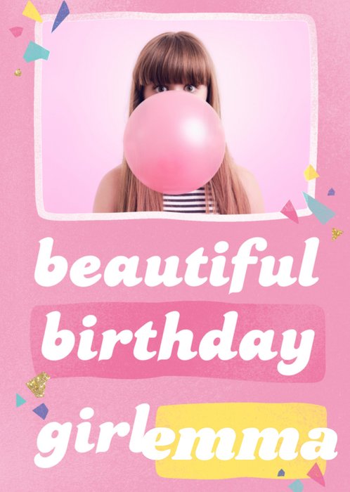 Roze fotokaart met foto en aanpasbare naam op de kaart staat: Beautiful birthday girl Emma.