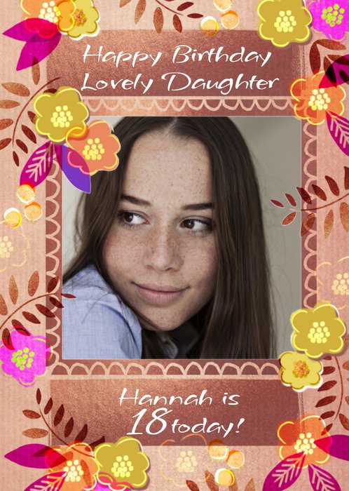 Vrolijke verjaardagskaart met foto en de tekst: Happy birthday lovely daughter Hannah is 18 today! De tekst is aanpasbaar.