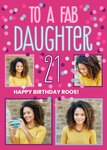 Vrolijke fotokaart met leeftijd en aanpasbare naam. Op de kaart staat: To a fab daughter 21 happy birthday Roos!