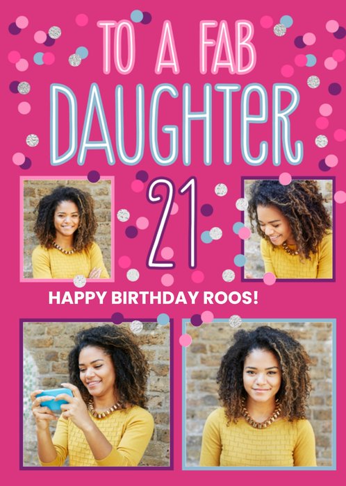Vrolijke fotokaart met leeftijd en aanpasbare naam. Op de kaart staat: To a fab daughter 21 happy birthday Roos!