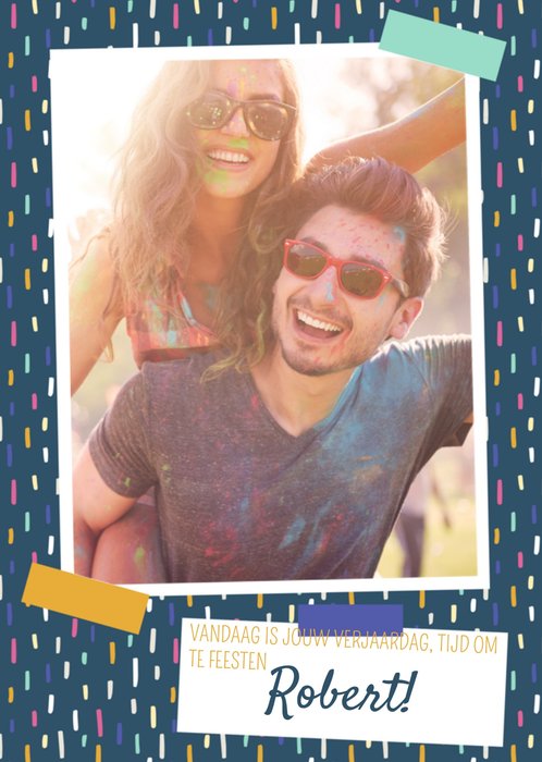 Op deze feestelijke fotokaart staat: Vandaag is jouw verjaardag, tijd om te feesten Robert! De naam is aanpasbaar.