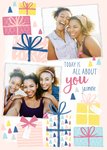 Vrolijke fotkaart met cadeautjes en de tekst: Today is all about you Jasmine.