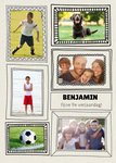Leuke verjaardagskaart met allemaal fotolijstjes voor persoonlijke foto's en aanpasbare naam.