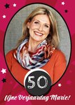 Rode fotokaart met leeftijd en aanpasbare naam.