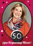 Rode fotokaart met leeftijd en aanpasbare naam.
