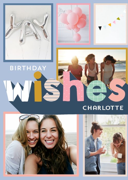 Leuke fotokaart met naam en de tekst: Birthday wishes Charlotte. De naam is aanpasbaar.