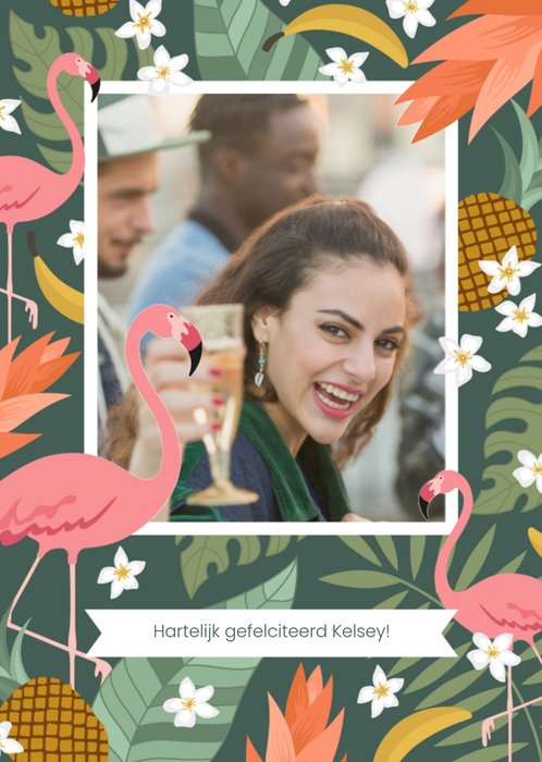 Een vrolijke fotokaart voor een jarige job. Op deze tropische kaart is de naam aanpasbaar.