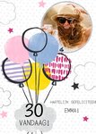 Vrolijke verjaardagskaart met ballonnen, foto en aanpasbare naam.