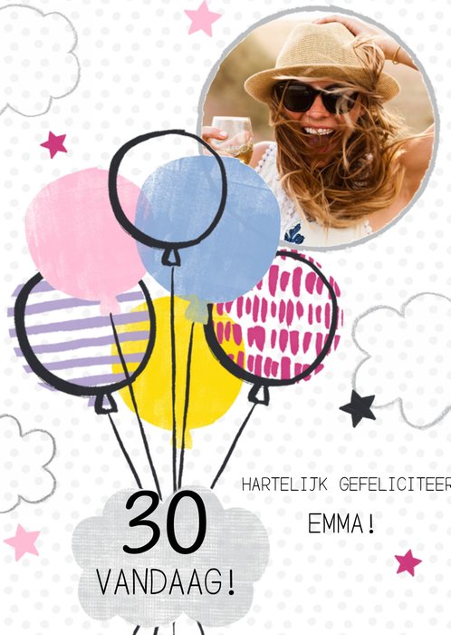 Vrolijke verjaardagskaart met ballonnen, foto en aanpasbare naam.
