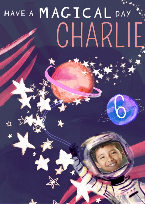Leuke fotokaart met sterren en planeten. Op de kaart staat: Have a magical day Charlie en het cijfer 6.