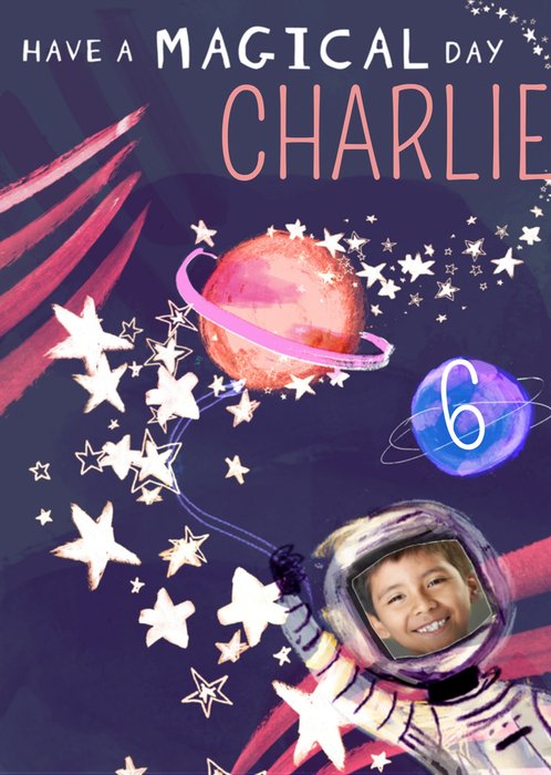 Leuke fotokaart met sterren en planeten. Op de kaart staat: Have a magical day Charlie en het cijfer 6.