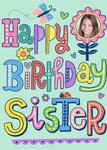 Fleurige verjaardagskaart met foto en de tekst: Happy birthday sister.
