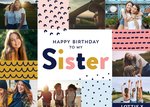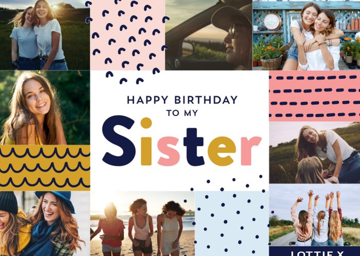 Vrolijke verjaardagskaart met de mogelijkheid om verschillende foto's toe te voegen. Op de kaart staat: Happy birthday to my sister Lottie X
