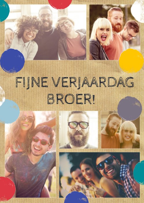 Kleurrijke verjaardagskaart met gekleurde stippen op de kaart. Je hebt de mogelijkheid om eigen foto's toe te voegen. Op de kaart staat: Fijne verjaardag broer!