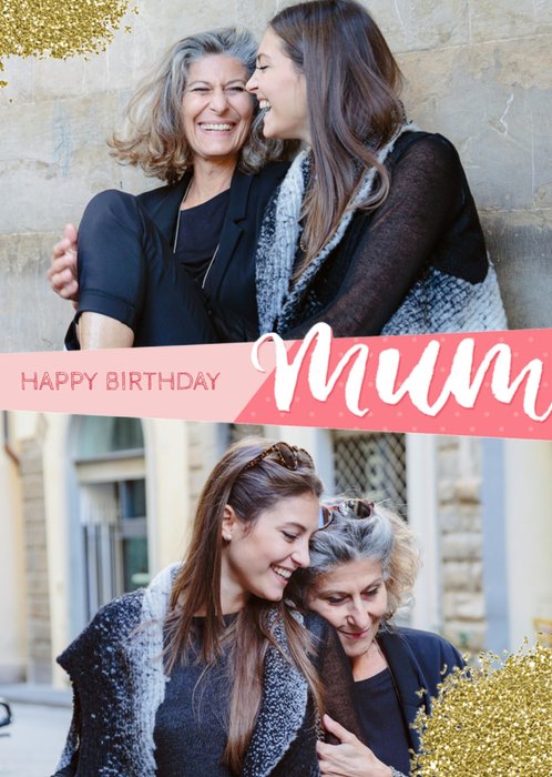 Leuke verjaardagskaart waar je twee eigen foto's aan toe kan voegen. Op de kaart staat: Happy birthday mum.