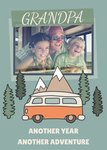 Mooie verjaardagskaart met bergen, bomen en een auto. Op de kaart staat: Grandpa another year another adventure.