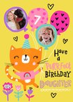 Schattige verjaardagskaart met een katje die ballonnen vastheeft. In een van de ballonnen kan een foto geplaatst worden. Op de kaart staat: Have a purrfect birthday daughter.