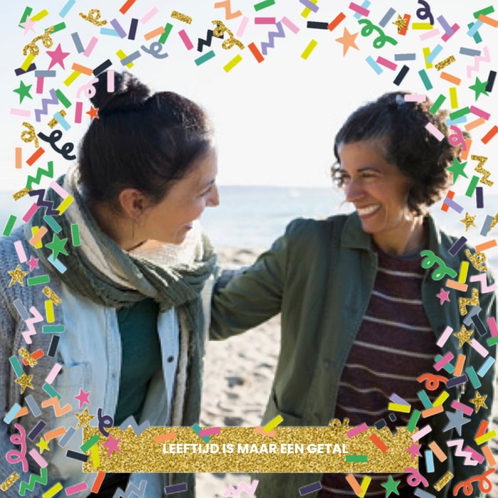 Leuke, feestelijke fotokaart met de tekst: Leeftijd is maar een getal.