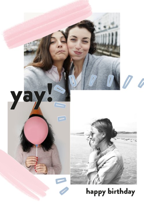 Leuke fotokaart voor een jarige. Op de kaart staat: Yay! Happy birthday.