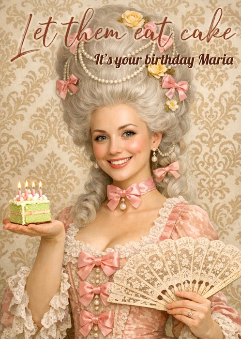 Met een vintage portret in stijl van een vrouw in een roze rococo-jurk met een gepoederde pruik, die een klein verjaardagstaartje met kaarsjes en een kanten waaier vasthoudt, met tekst erboven, op een beige achtergrond met vintage patroonbehang. Met de mogelijkheid om een gezichtsfoto te uploaden.