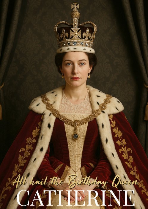Met een koninklijk portret van een vrouw verkleed als koningin, met een met juwelen bezette kroon en een rode jurk, met de optie om een foto te uploaden voor een gezichtswissel.