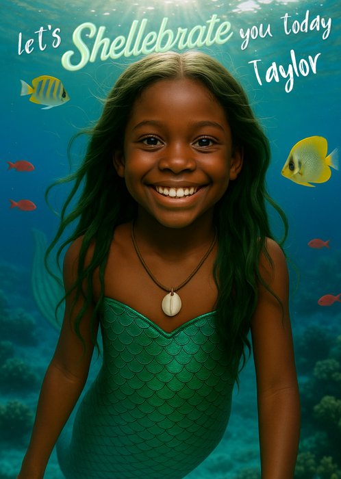 Met een glimlachende zeemeermin onder water met een foto-upload voor gezichtsverwisseling, omringd door tropische vissen en bubbels op een blauwe achtergrond.