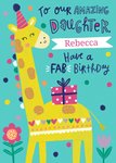 Schattige kaart met giraf en de tekst: To our amazing daughter Rebecca have a fab birthday Wenskaart van Greetz ontworpen door Greetz designers, volgens de laatste trends. Voeg je eigen foto('s), tekst, & versiering toe om de kaart extra persoonlijk te maken. Je kunt de kaart toevoegen aan je favorieten of tussentijds opslaan om deze later af te maken. Meer verjaardagskaarten zien? Check ze hier.