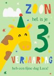 Schattige verjaardagskaart met ee giraf en aanpasbare naam.