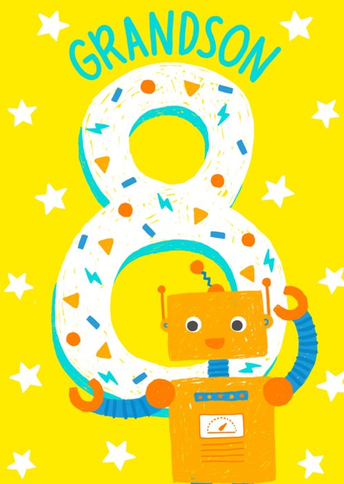 Leuke verjaardagskaart met een robot die het getal 8 vast heeft.
