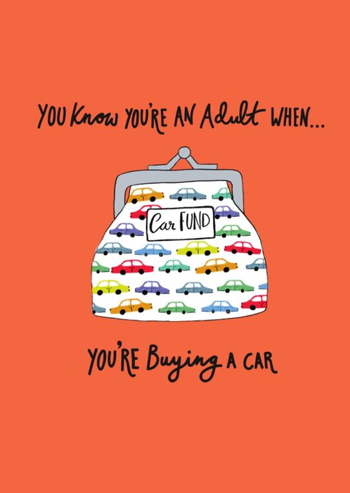Grappige verjaardagskaart met portemonnee en de tekst: You know you're an adult when... you're buying a car.