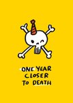 Grappige verjaardagskaart met een schedel en de tekst: One year closer to death.