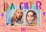 Kleurrijke verjaardagskaart met daarop hartjes, sterren en bliksemschichten erop. Op de kaart staat: Daughter. Happy 16th birthday. Je kunt een eigen foto toevoegen.