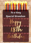 Gezellige verjaardagskaart met een taart en kaarsjes. Op de kaart staat: To a very special grandson Happy 18th birthday
